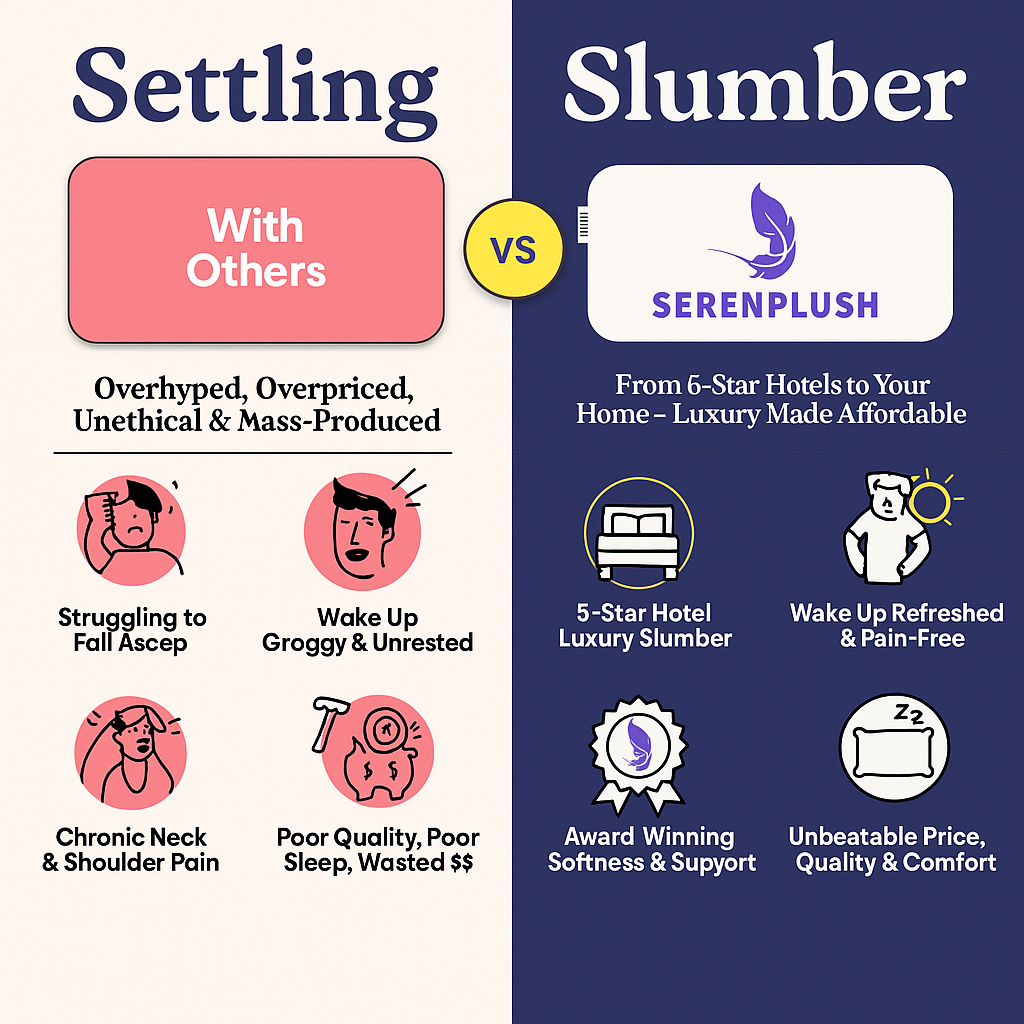 The Serenplush Hotel Quality Pillow features a soft, lofty fill with quick bounce-back, encased in a durable, down-proof cotton cover. Its breathable blend and internal baffles ensure cool, consistent support all night long.